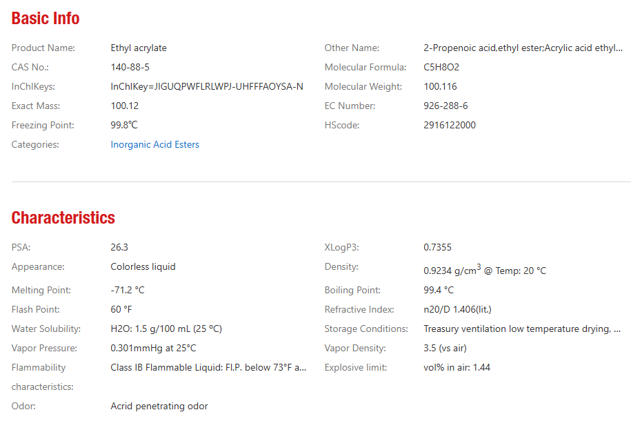 Acrylic acid, ethyl ester (inhibited)CAS140-88-5molecular formulaC5H8O2molar mass100.12density0.921 g/mL at 20°Cmelting point−71°C(lit.)flash(ing) point60 °Fwater solubility1.5g / 100ml (25 ºC)solubility20g/lvapour pressure31 mm Hg (20 °C)vapor density3.5 (for air)appearanceliquidsmellTypical acrylic scent; Sharp, fragrant; Spicy; Kind of gross; Sharp, esters.Storage condition2-8℃stabilityStable, but may converge under light. Highly flammable. Keep it cool. Incompatible with oxidants, peroxides, and other polymerization initiators.explosion limits1.8-14%(volts)refractive indexn20/D 1.406(lit.)Physical and chemical propertiesColorless liquid, volatile.
