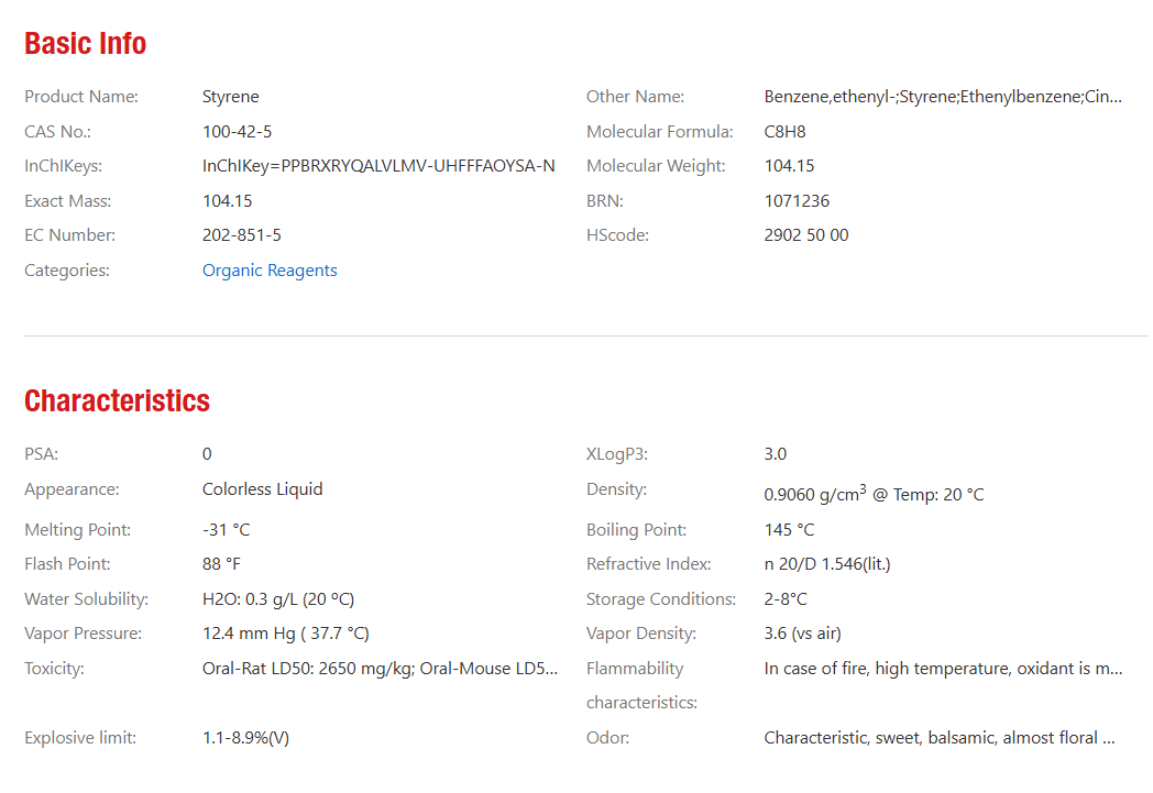 Styrene, also known as ethenylbenzene, vinylbenzene, and phenylethene, is an organic compound, chemical formula is C8H8, vinyl electrons and benzene conjugated ring, insoluble in water, soluble in ethanol, ether and other organic solvents, is an important monomer of synthetic resin, ion exchange resin and synthetic rubber. Styrene is mainly used as an important monomer of synthetic resin, ion exchange resin and synthetic rubber, and can also be used in pharmaceutical, dye, pesticide and mineral processing industries.